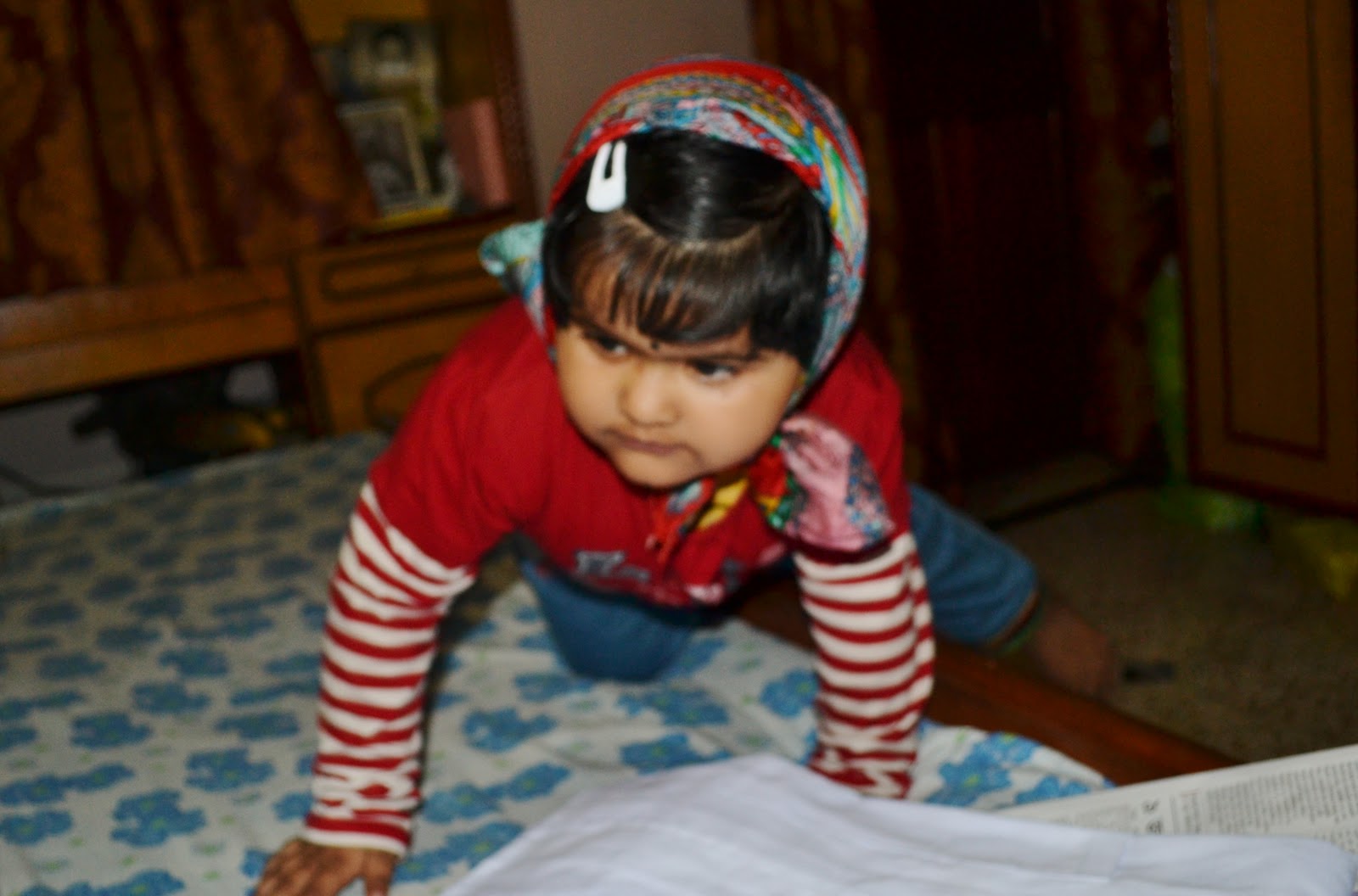 | Little cutie pie trying to climb up the huge bed |